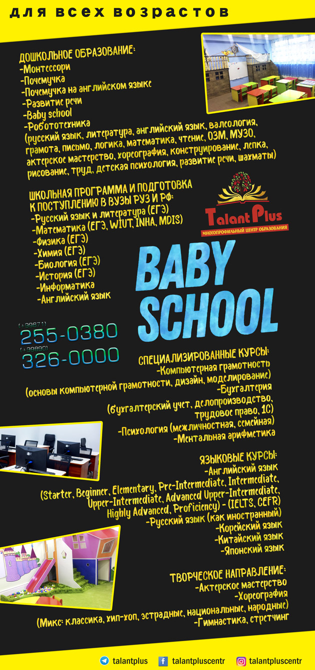 Центр Образования TalantPlus-это единственный учебный центр в Узбекистане, который работает в более чем 30 направлениях. У нас вы сможете найти большой спектр курсов, как базового, или дополнительного, так и профессионального образовательного уровня всех сфер.