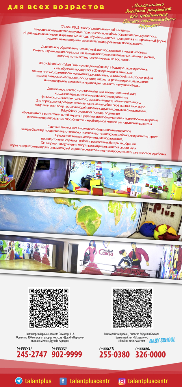 Обучение в нашем центре проходит в игровой форме, креативными, уникальными, методиками, разработанные профессионалами-учителями, которые работают в TalantPlus. Только специалисты высшей категории, предоставляют для вас наши лучшие услуги в сфере образования, своим индивидуальным и творческим подходом.